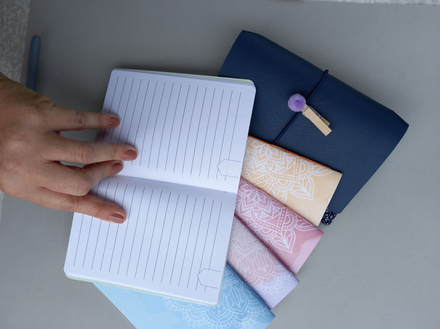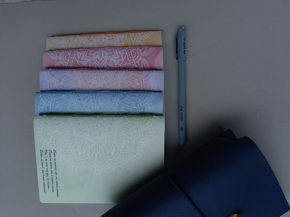 Na verdade, uma capa super versátil em material sintético forrada com tecido 100% algodão, reutilizável e permanente, constituída por elásticos onde entram cadernos brochuras (um ou mais). Os cadernos podem ser substituídos na medida do uso. Tamanho 15x21cm.